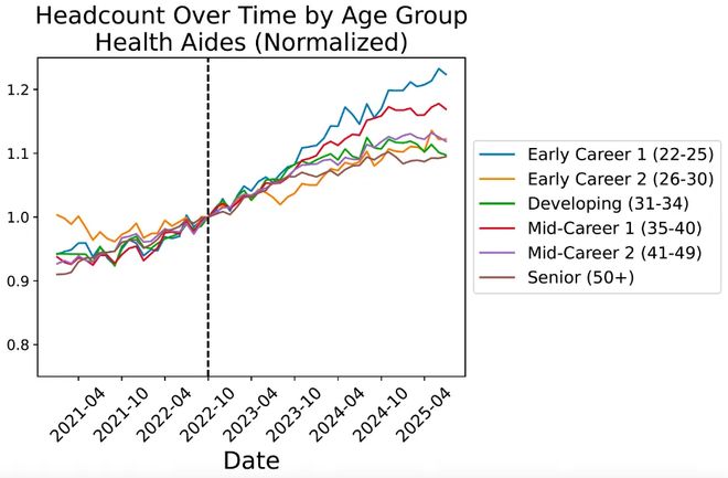 在此期间,美国经济还发生了许多其他变化。尤其是软件开发人员的就业下滑趋势,很可能无法仅用AI来解释,因为自2022年底之后,下滑速度过快。