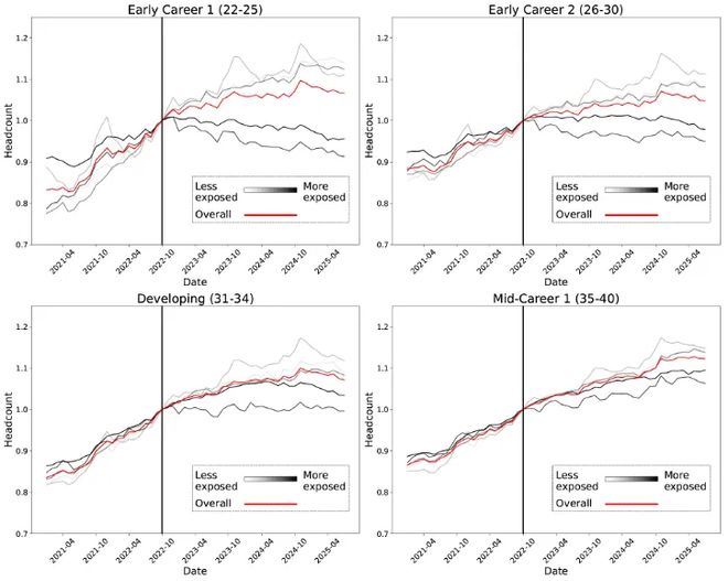 对于22至25岁的人群,在受AI影响最小的职业中就业率在上升,爱游戏AYX体育但在受AI影响最大的职业中则显著下降。