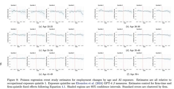 结果依然表明:即便控制了这些因素,年轻劳动者在AI高度暴露岗位上的冲击依旧显著,和主文的分析一致。